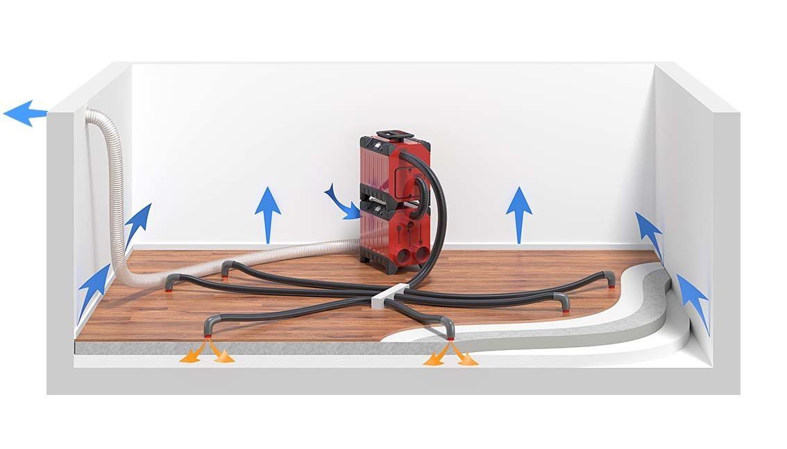 -Pose dehumidifiers to eliminate excess moisture in the air by condensation.The moisture is recovered in the form of condensates in a container or directly discharged into the wastewater networks (Example of use: dwelling house, apartment building, restaurant, office, ...).-Insufflation of hot and dry air in cavities and insulating layers (Example of use: false ceiling plasterboard or paneling, various filling in wooden floors, ...).